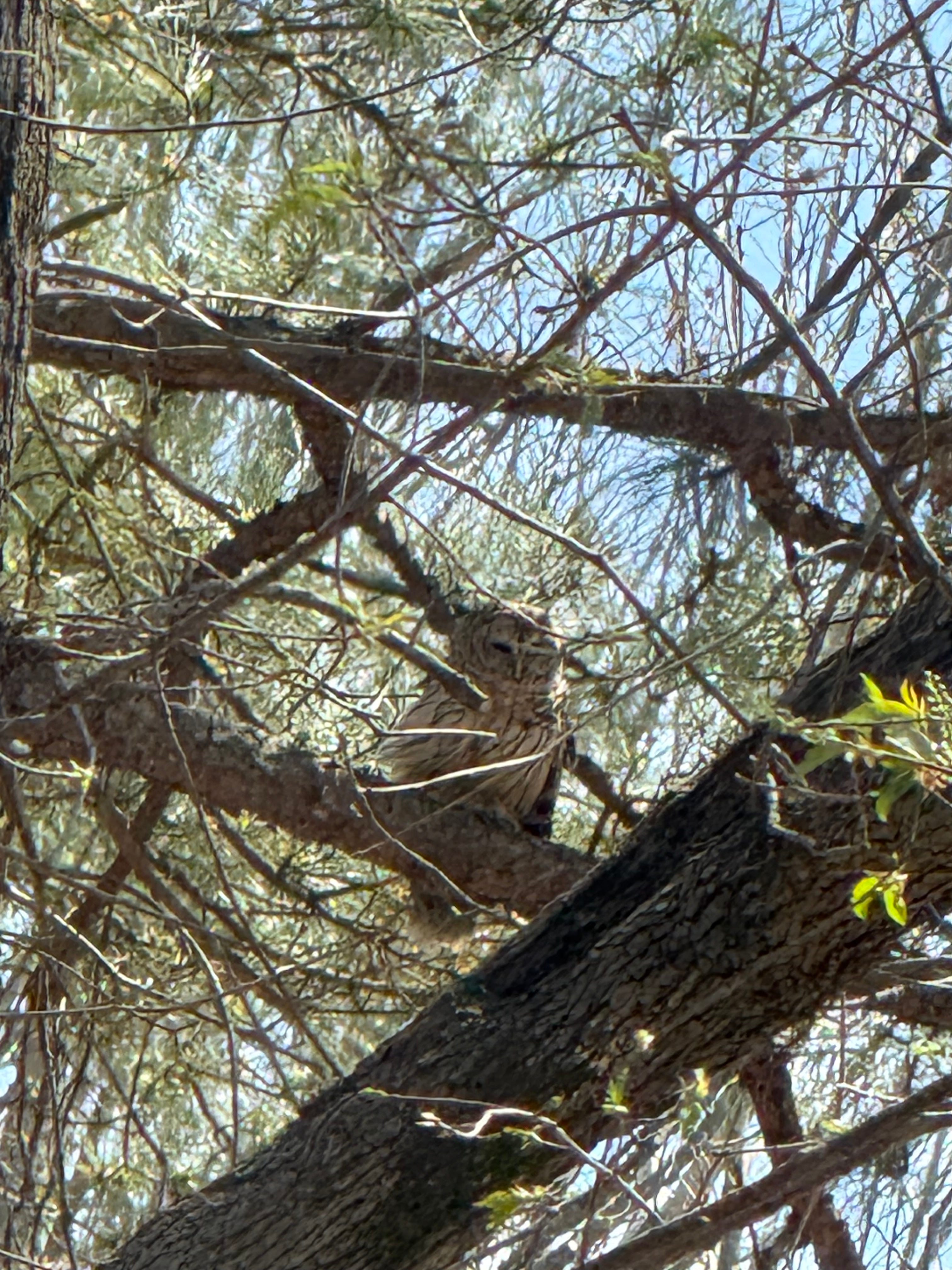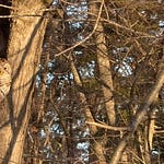 After lunch I left the patio door open so Charlie could run in and out. I heard Mister hooting, and Missy heard him too. She came back out as if eager to meet him and flew all the way out of my yard, to the first row of trees in the woods. They hooted back and forth. His hoot is lower than hers. I didn’t want to spook him so I avoided trying to find him, but I could hear that he was near my roof, to my right. I called Charlie in. Mister’s so shy. When he didn’t come to Missy, she flew back to perch in my large pine tree for a few minutes and then swooped back into the hollow. A long distance call is better than nothing! It’s always like a flash of golden light to watch her flying.
